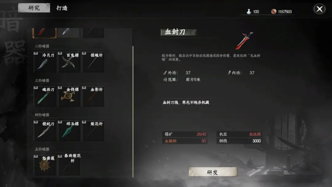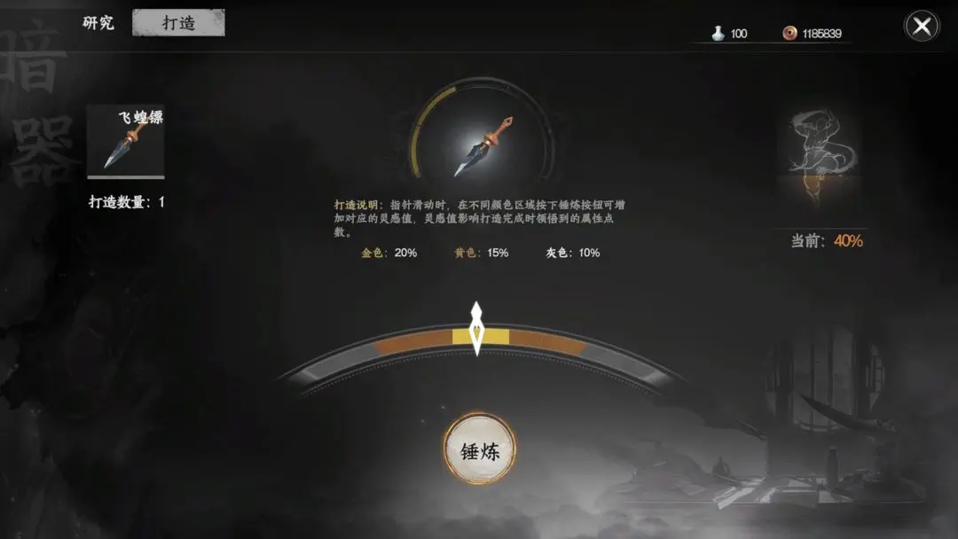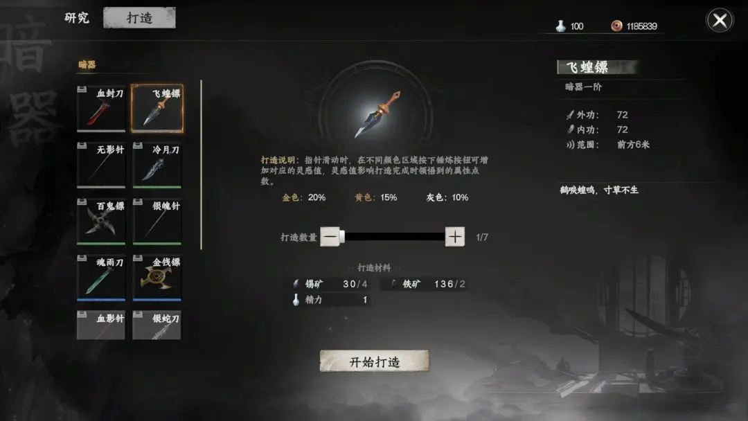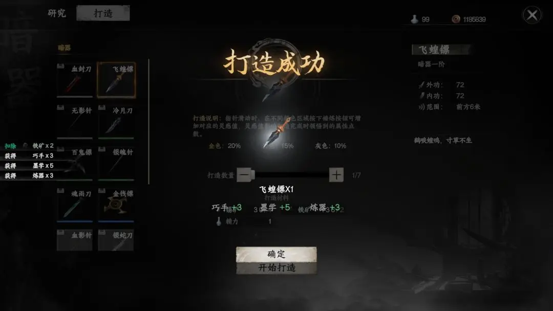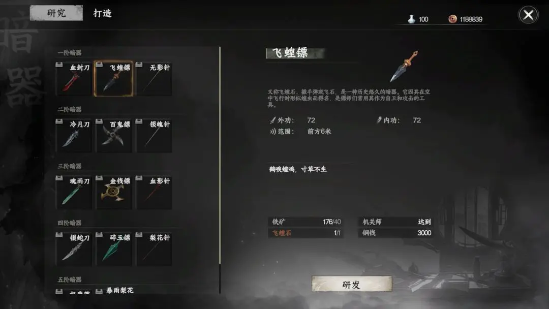 三种属性只需要在铁匠铺购买矿石然后一直打造飞蝗镖刷属性到可以研发下一阶暗器晋升身份