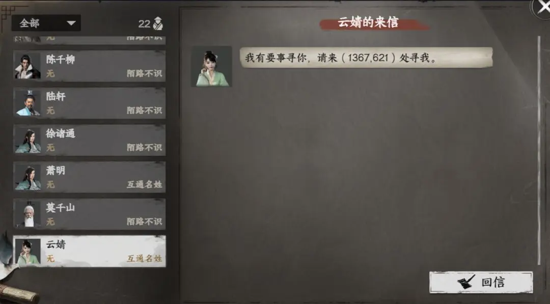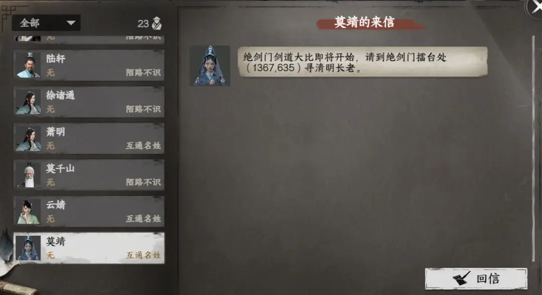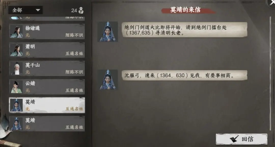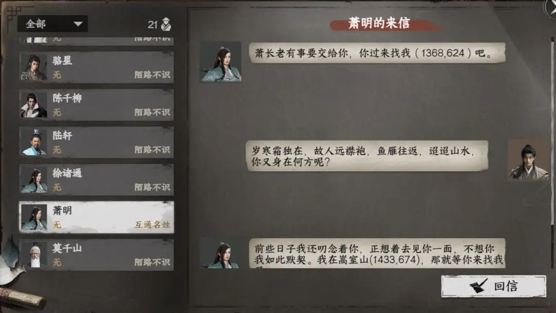 1、做悬赏任务将门派好感提升到25时收到萧明发来飞鸽,如果不在飞鸽里的位置可以回信询问位置过去找他