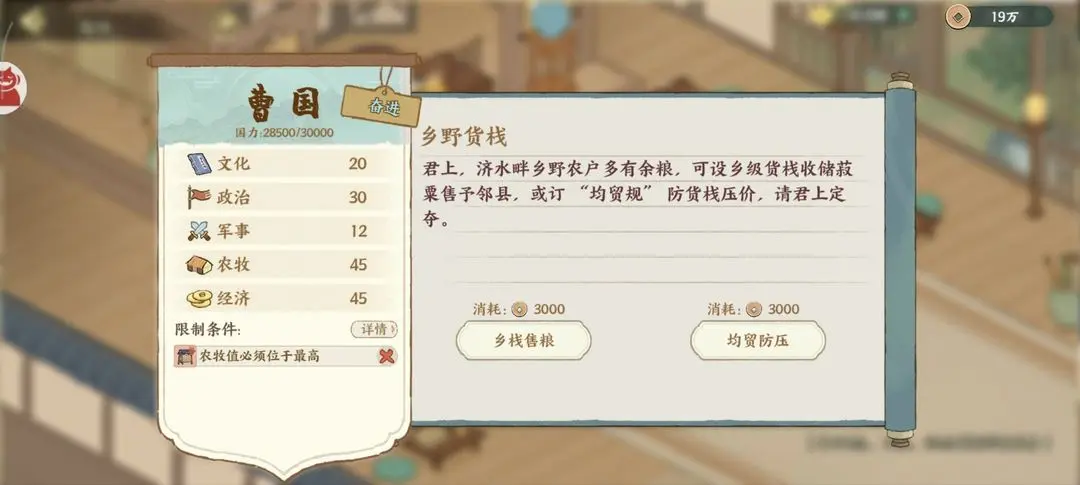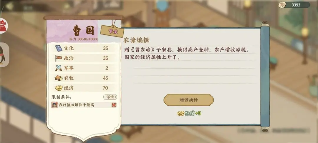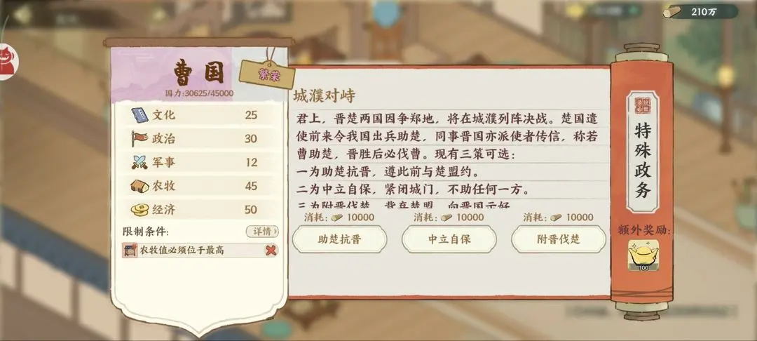 华夏绘世录曹国主要需要选择加农牧文化的选项,在遇到各个事件时选择的选项不同会加成不同的属性数值,初定根基时选择徭民垦田,盐铁断供时选择赂齐求盐,其他各个政务推荐最优的选择内容见下文详情!