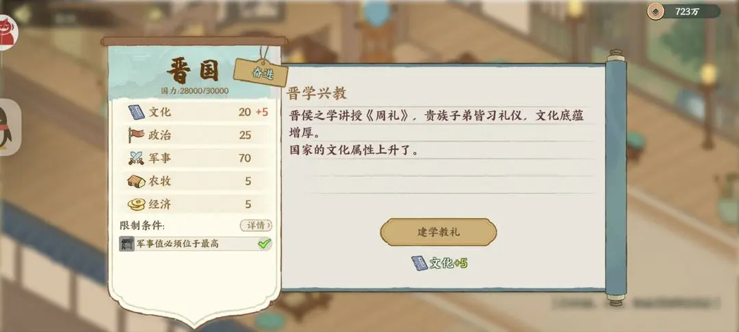 华夏绘世录中晋国的政务优派主要推荐加军事政治农牧,遇到各个事件时选择的选项不同会加成不同的属性数值,下方是详细的晋国各个政务最优推荐的选择内容详情!