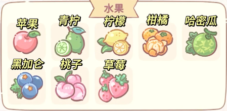 苹果、青柠、柠檬、柑橘、哈密瓜、黑加仑、桃子、草莓