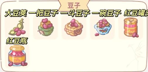 大豆荚、一把豆子、一斗豆子、一碗豆子、红豆罐头、红豆瓶