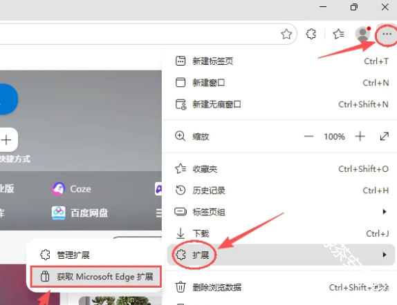 1、点击浏览器右上角三点,并选择扩展程序,浏览器不同选择的也不相同,这里选择的是管理扩展程序-获取扩展