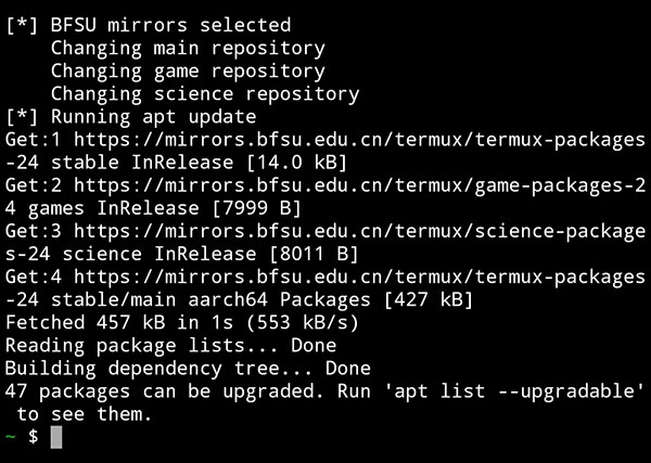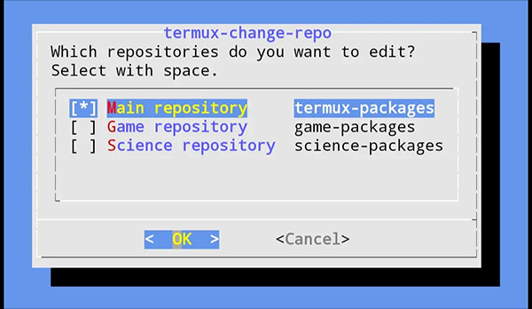 2、在Termux中执行命令termux-change-repo进入图形界面如下图