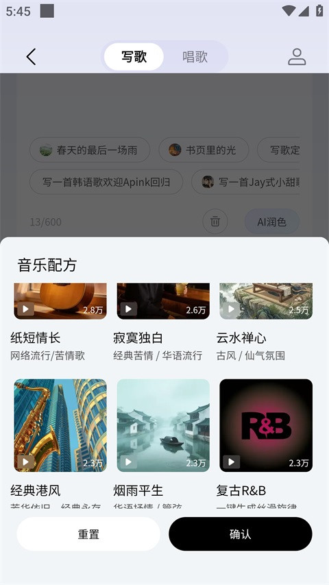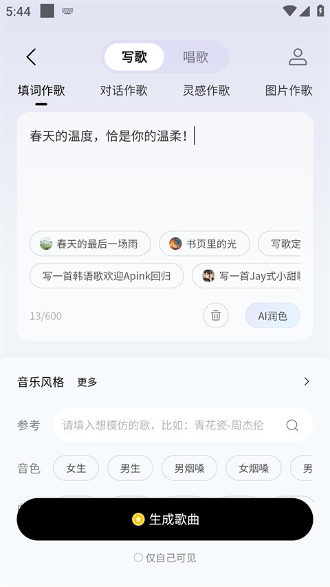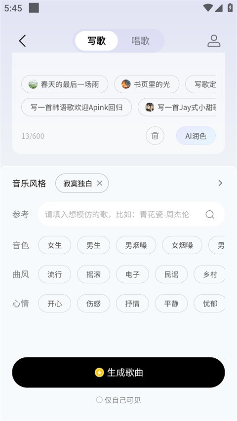 4、根据创作需求,自由搭配音色、曲风与情绪氛围