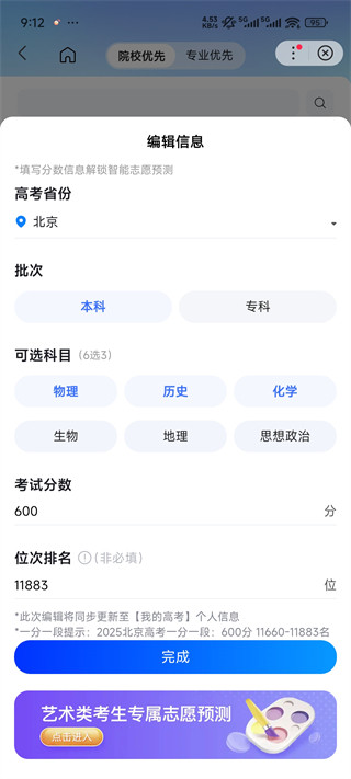 3、选择高考省份、选择批次、选择可选科目、输入考试分数点击完成