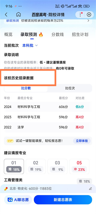 5、点击你心仪的学校,可以看到有该校历史招录数据