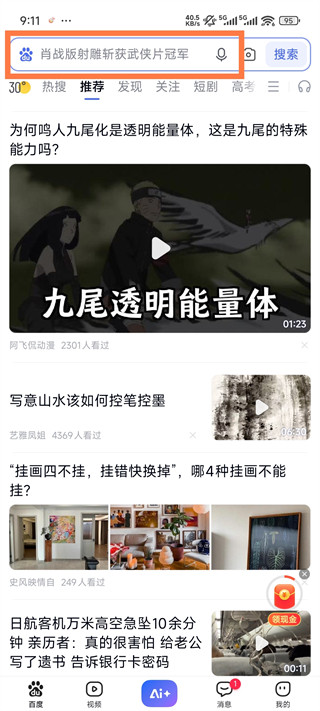 1、打开百度app,点击最上方搜索框,搜索高考